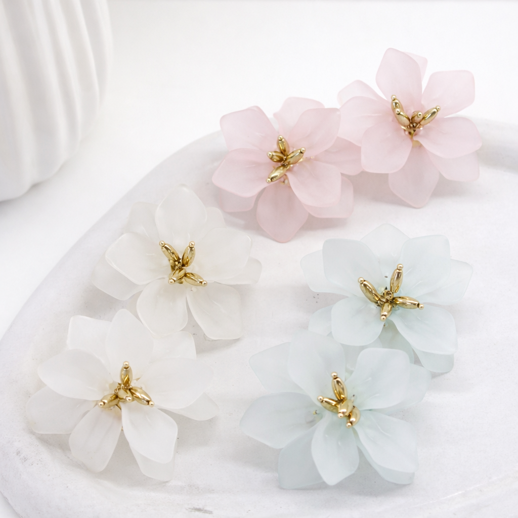 Ρομαντικά σκουλαρίκια σε σχήμα λουλουδιού με παστέλ πέταλα και διακριτικές χρυσές λεπτομέρειες στο κέντρο. Το ματ φινίρισμα των πετάλων δημιουργεί απαλό, elegant αποτέλεσμα, ιδανικό για ανοιξιάτικες και καλοκαιρινές εμφανίσεις. Ελαφριά και άνετα, προσθέτουν θηλυκότητα και φρεσκάδα στο look χωρίς υπερβολή.