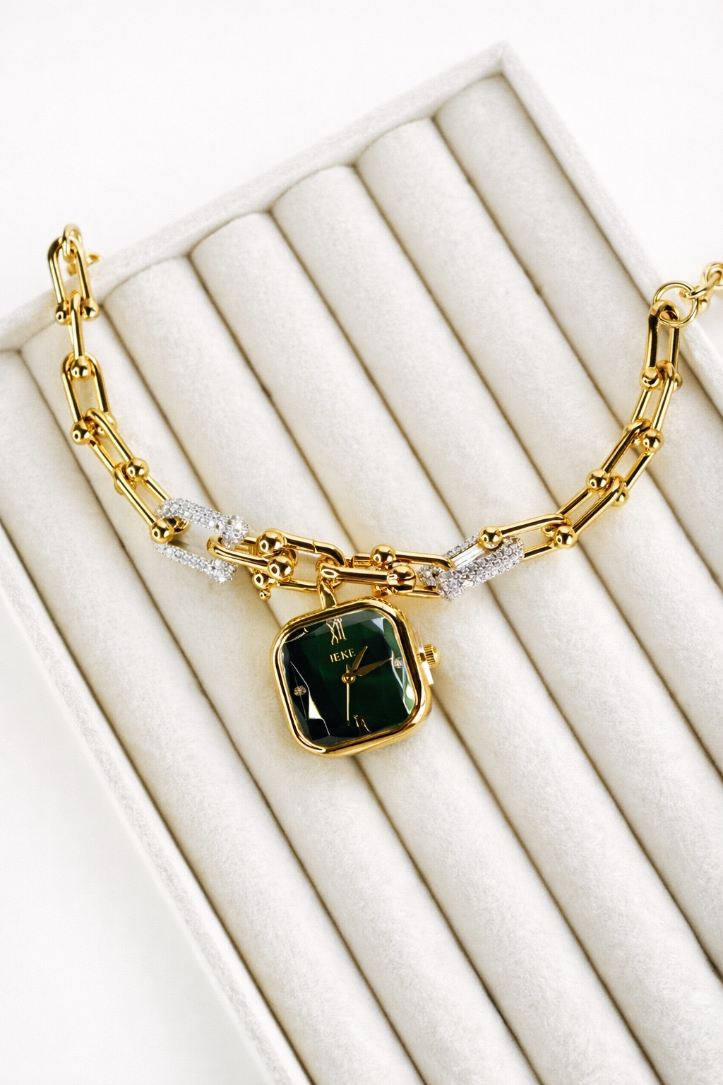 Ένα μοναδικό κόσμημα που συνδυάζει κομψότητα και λειτουργικότητα. Το γυναικείο ρολόι-αλυσίδα με χρυσή αλυσίδα και λαμπερές λεπτομέρειες ζιργκόν αποτελεί ένα statement αξεσουάρ που τραβάει τα βλέμματα. Ιδανικό για καθημερινή κομψότητα αλλά και για ιδιαίτερες εμφανίσεις.