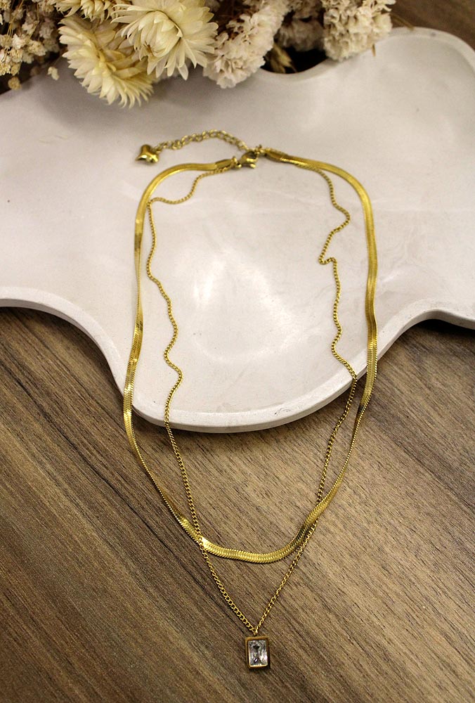 Κομψό διπλό κολιέ σε χρυσό χρώμα με λεπτές αλυσίδες και διακριτικό κρύσταλλο. Minimal και εκλεπτυσμένο, ιδανικό για να προσθέσει διαχρονική λάμψη σε κάθε εμφάνιση.